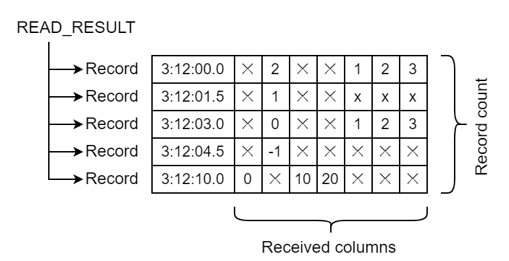 hive_continuous_reader_read()This function collectively retrieves data entering from the input port for a certain time width and stores it inread_result, a pointer to aHIVE_COLUMN_READ_RESULTstructure. TheHIVE_COLUMN_READ_RESULTstructure consists of multiple records that store data from the same time as shown below. Each record stores multiple columns of data.
