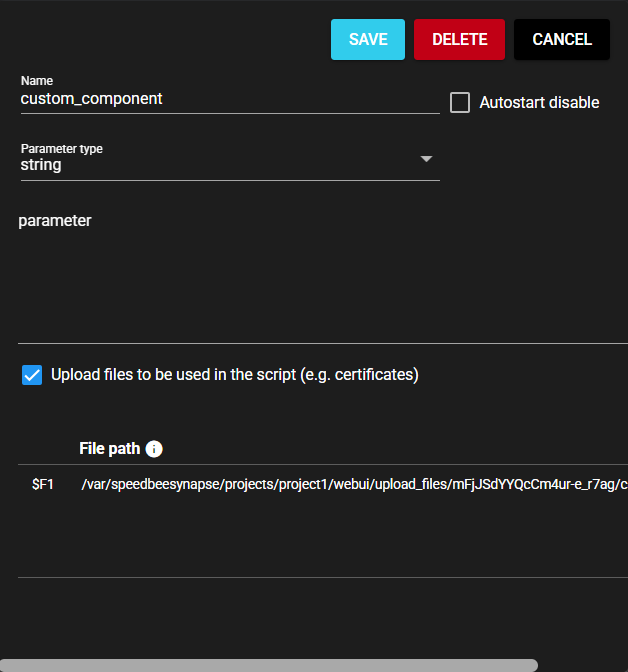 | Add file | Press this button to upload the file to be used in the script. Note: Newly added files are uploaded when you save the component settings. |