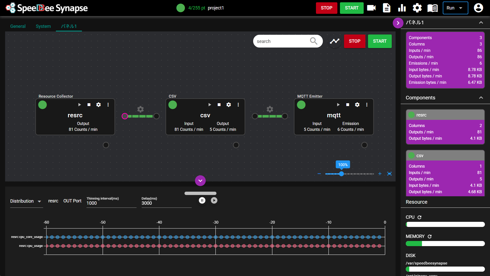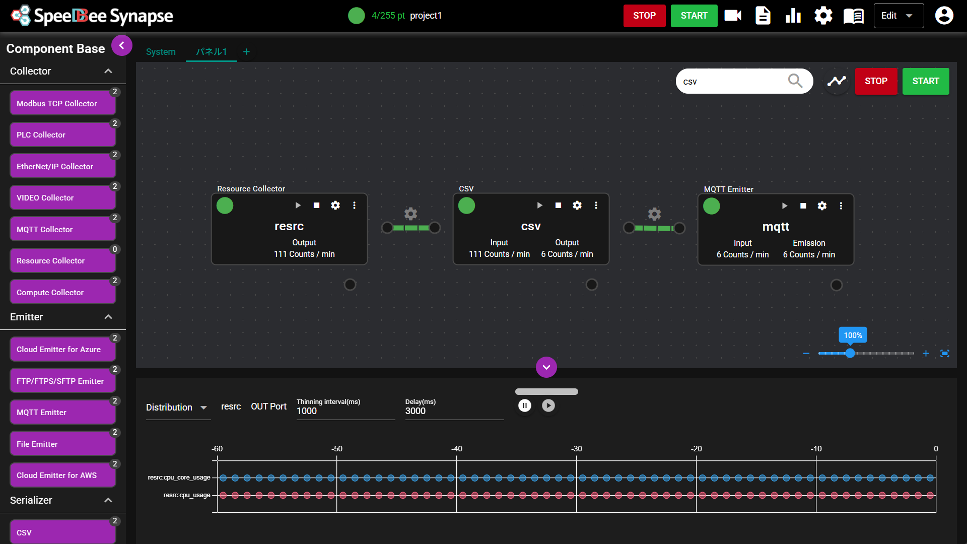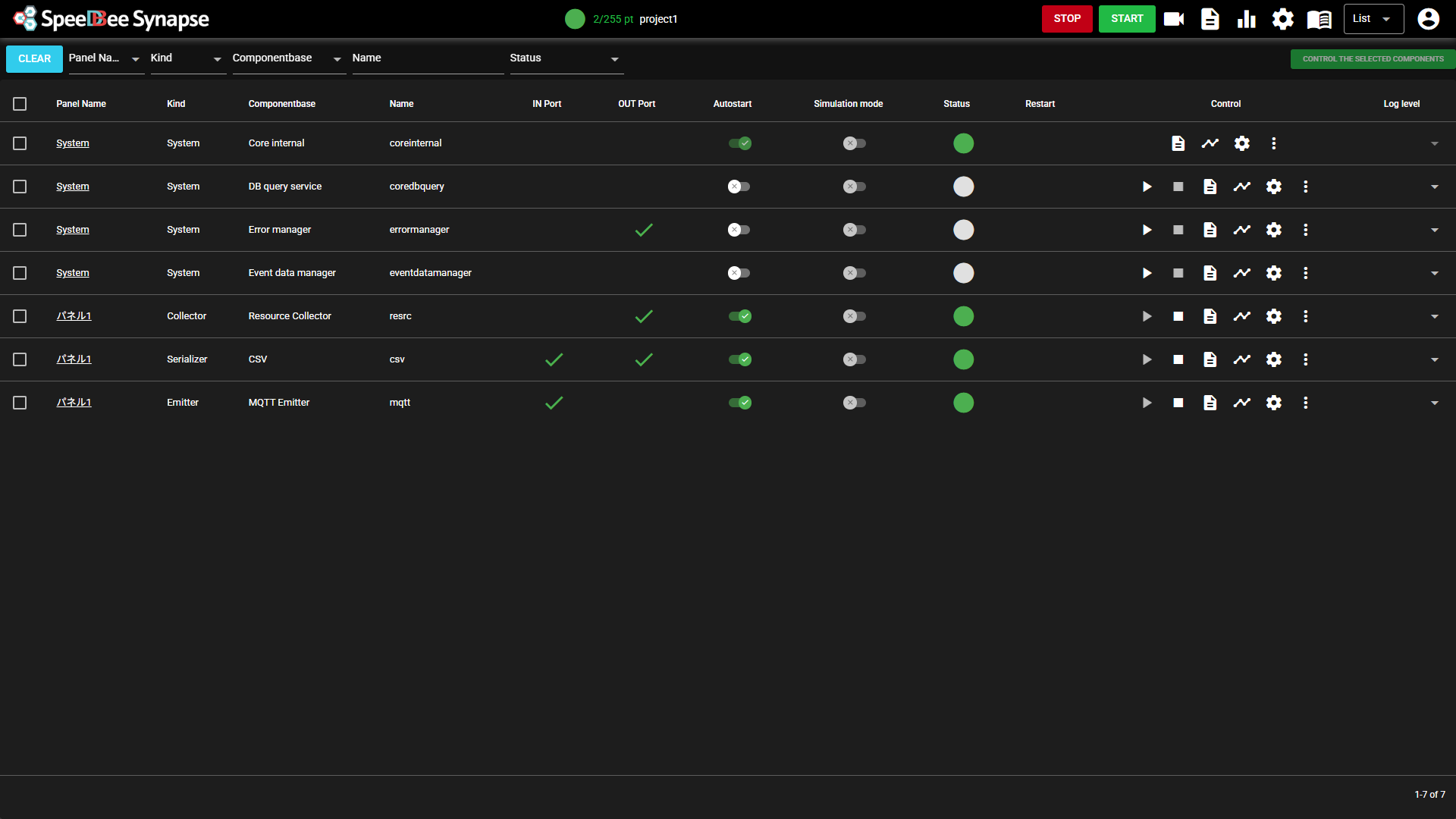 | ④ | Start button | Clicking the Start button starts all the components registered in SpeeDBee Synapse for which "Autostart disable" is set to OFF. |