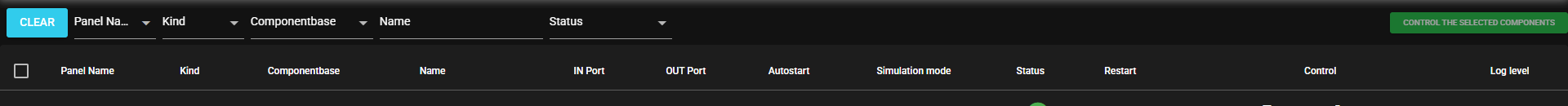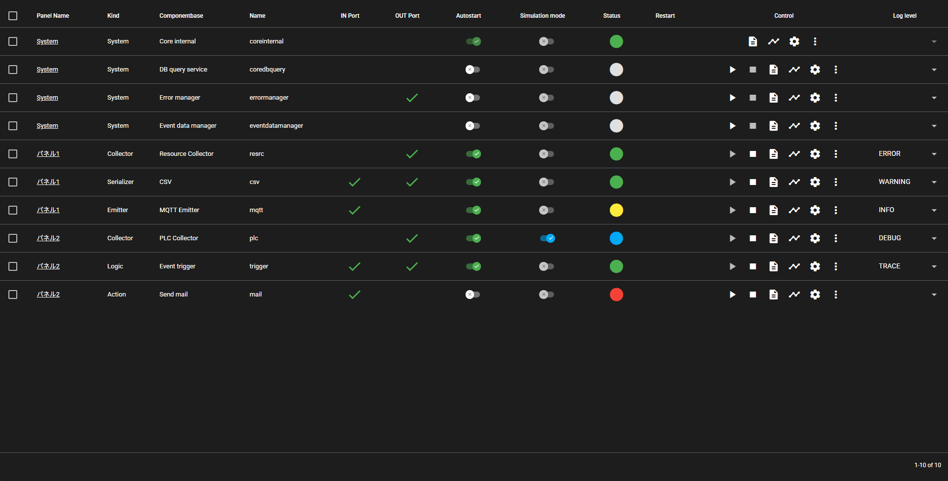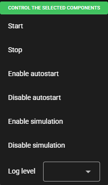 Control the Selected components is a function that controls the selected components in List Mode. Operations such as start, stop, toggle autostart, toggle simulation mode, and select log level can be performed collectively on the selected components.