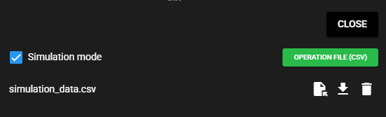 Item Description Simulation mode Enable/disable simulation mode Operation file (csv) A CSV file that defines the columns and data used in simulation mode. For detail, see Formatting Driving Files. Once a driving file is uploaded, its configurations are retained until deleted.
