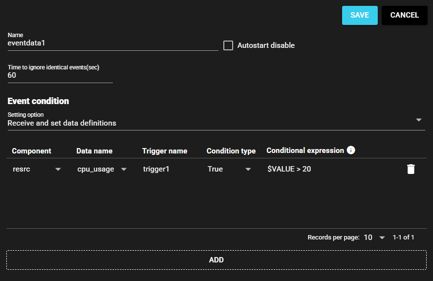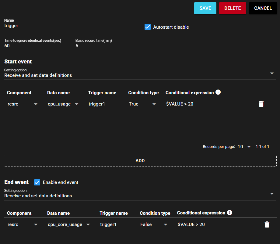 Item Description Name Event Trigger 1 Autostart disable OFF Time to ignore identical events(sec) 60 Basic record time(min) 5 Setting option Receive and set data definitions Component resource Data name cpu usage Trigger name trigger1 Condition type True Conditional expression $VALUE > 20 Enable end event ON Setting option Receive and set data definitions Component resource Data name cpu_usage Trigger name trigger1 Condition type False Conditional expression $VALUE > 20 -