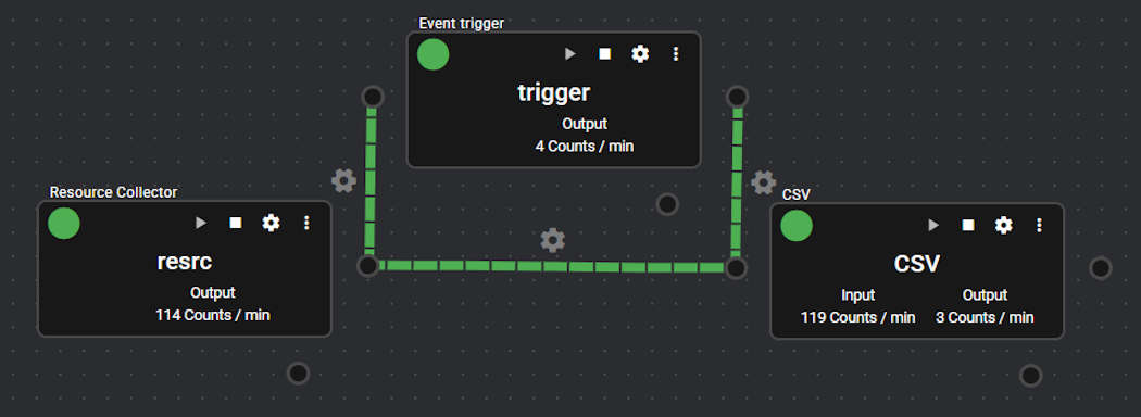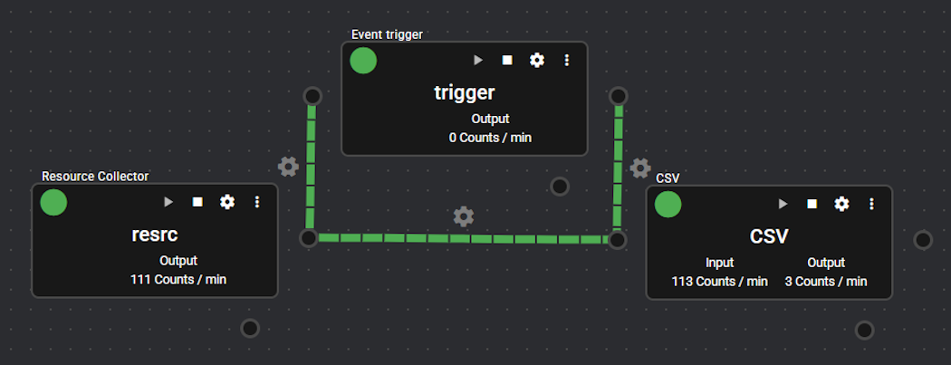 An example of setting an event trigger is as follows. Here, the first step is to make settings to allow the CPU usage collected by a resource collector to be processed by a CSV serializer. Then, use a event trigger so that processing occurs only when the CPU usage exceeds 20%.