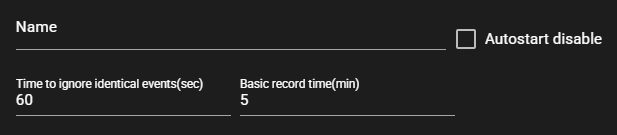 Note: The same name as another component name cannot be used.Autostart disable Select ON to disable the Autostart of the component. Time to ignore identical events(sec) Enter time to ignore the identical events Basic record time(min) Enter the basic record time in minutes -