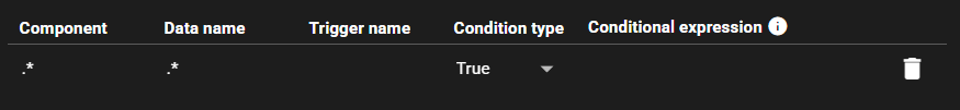 Note: Can be entered only when the setting option is Set by regular expressionTrigger name Enter a name for the trigger Condition type True: A trigger occurs if the conditional expression is true
