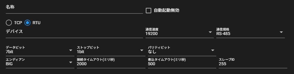 ※通信方式がRTUの場合に選択可能エンディアン 書き込む値のバイトオーダ 接続タイムアウト(ミリ秒) 機器への接続にかける時間の上限 書込タイムアウト(ミリ秒) 値書き込みにかける時間の上限 スレーブID 接続先のスレーブID -