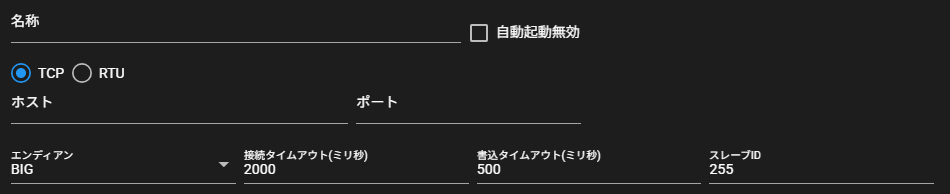 ※他のコンポーネント名と重複する事はできません。自動起動無効 コンポーネントの自動起動を無効にする場合ON 通信方式 TCPまたはRTUを選択 ホスト 接続する機器のホストorIPアドレス