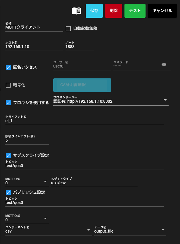 | プロキシを使用する | MQTTブローカーとの通信をプロキシサーバーを経由して行う場合ON |