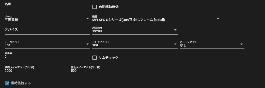 ※選択できる機種はメーカによって異なります。ホスト 接続するPLCのホストorIPアドレス ポート 接続するPLCのポート 接続タイムアウト(ミリ秒) PLCへの接続にかける時間の上限 書込タイムアウト(ミリ秒) 値書き込みにかける時間の上限 常時接続する PLCへの接続を問い合わせの都度、切断しない -