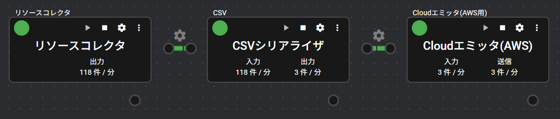 | ポート | 入力:1 シリアライザ・コンポーネントから、ファイル形式のデータを受け取ります。受け取ったデータは、AWS IoT Core向けに送信されます。 出力:0 システム:1 コンポーネントの稼働状況やエラー情報を出力します。出力するエラー情報の詳細は、「エラーコード一覧」をご覧ください。 |