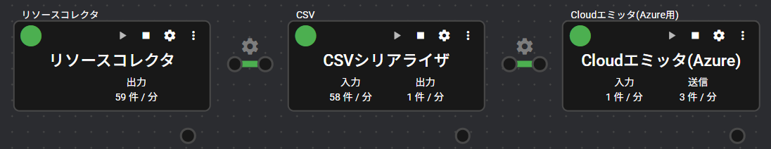 | ポート | 入力:1 シリアライザ・コンポーネントから、ファイル形式のデータを受け取ります。受け取ったデータは、Azure IoT Hub向けに送信されます。 出力:0 システム:1 コンポーネントの稼働状況やエラー情報を出力します。出力するエラー情報の詳細は、「エラーコード一覧」をご覧ください。 |