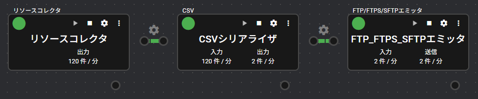 | ポート | 入力:1 シリアライザ・コンポーネントから、ファイル形式のデータを受け取ります。受け取ったデータは、FTPまたはSFTPによって転送されます。 出力:0 システム:1 コンポーネントの稼働状況やエラー情報を出力します。出力するエラー情報の詳細は、「エラーコード一覧」をご覧ください。 |