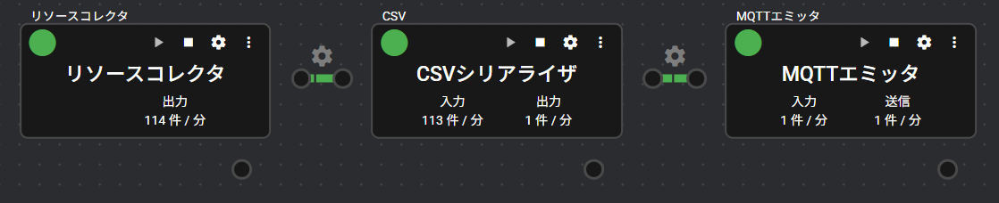 | ポート | 入力:1 シリアライザ・コンポーネントから、ファイル形式のデータを受け取ります。受け取ったデータは、MQTTプロトコル(Publish)によって送信されます。 出力:0 システム:1 コンポーネントの稼働状況やエラー情報を出力します。出力するエラー情報の詳細は、「エラーコード一覧」をご覧ください。 |