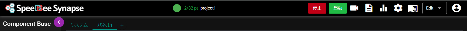 | ④ | 起動ボタン | クリックすると、SpeeDBee Synapseに登録されている、「自動起動無効」がOFFのコンポーネントがすべて起動します。 |