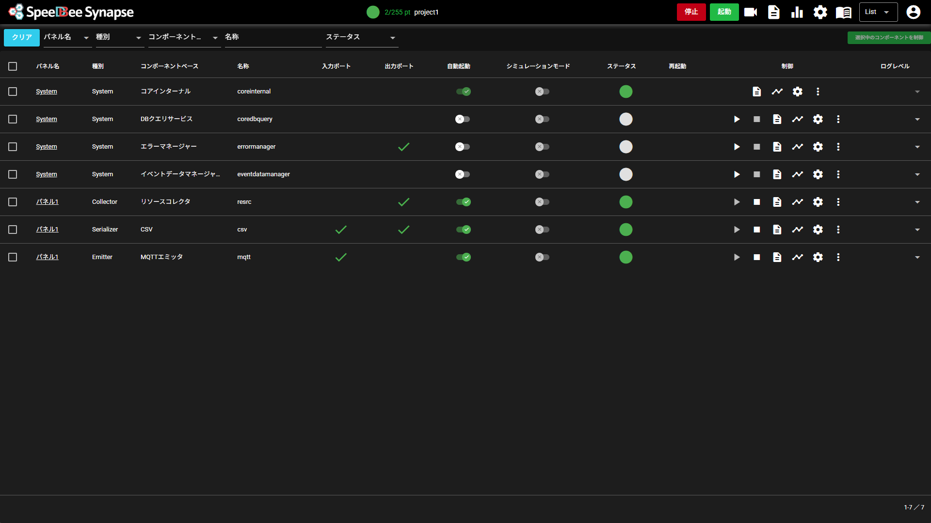 | ⑤ | 起動ボタン | クリックすると、パネル上の、「自動起動無効」がOFFのコンポーネントがすべて起動します。 |