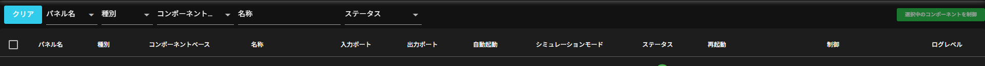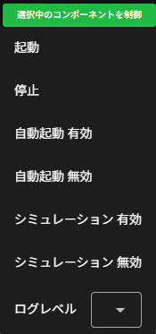 選択中のコンポーネントを制御は、List Modeで選択中のコンポーネントの制御を行う機能です。 起動・停止・自動起動の切り替え・シミュレーションモードの切り替え・ログレベル選択などの操作を、選択中のコンポーネントに対して一括で行うことができます。