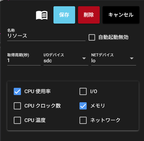 | ⑦ | グラフアイコン | クリックすると、Grafanaの画面が表示されます。 ※詳細は「Grafanaとの連携」をご覧ください。 |