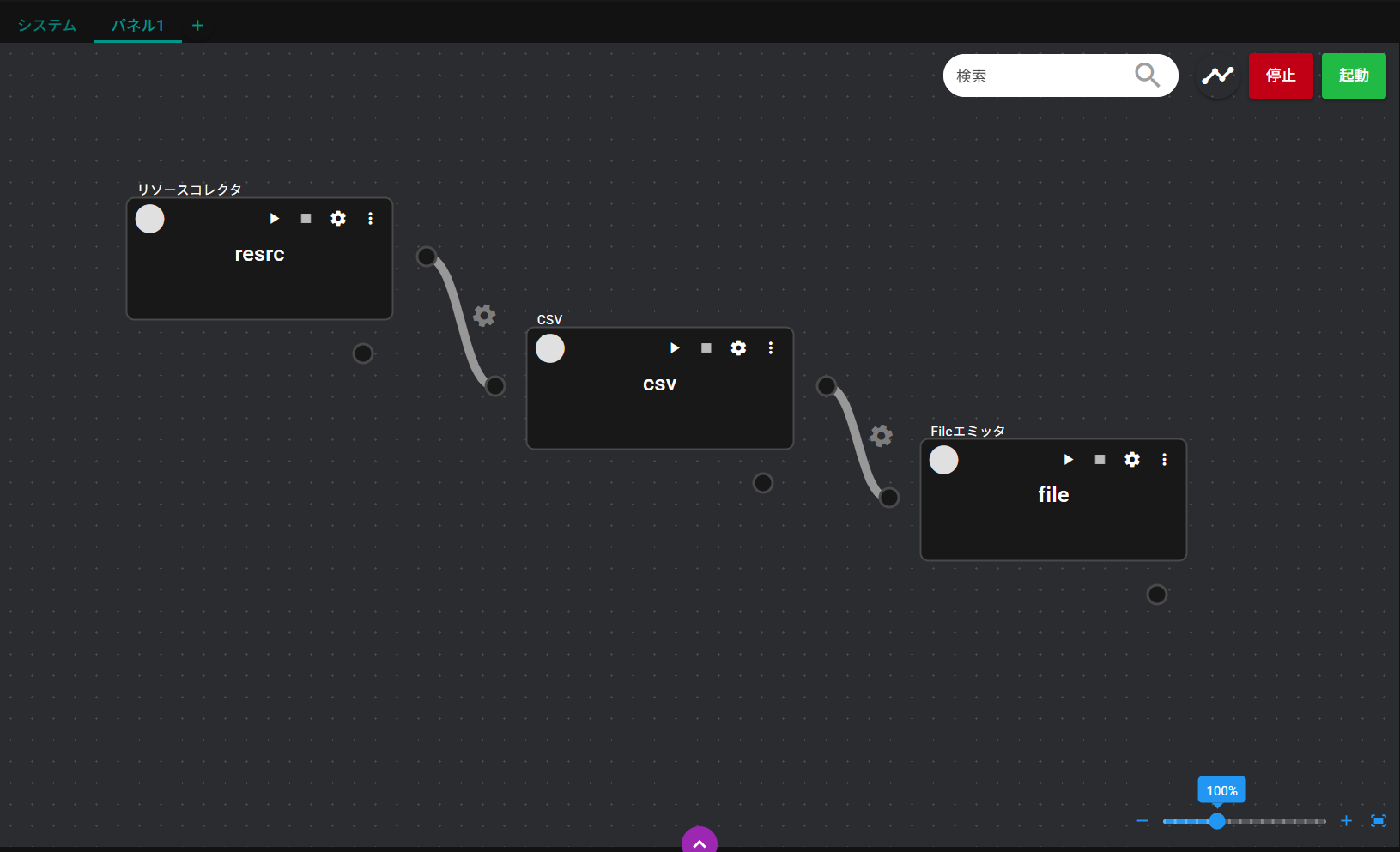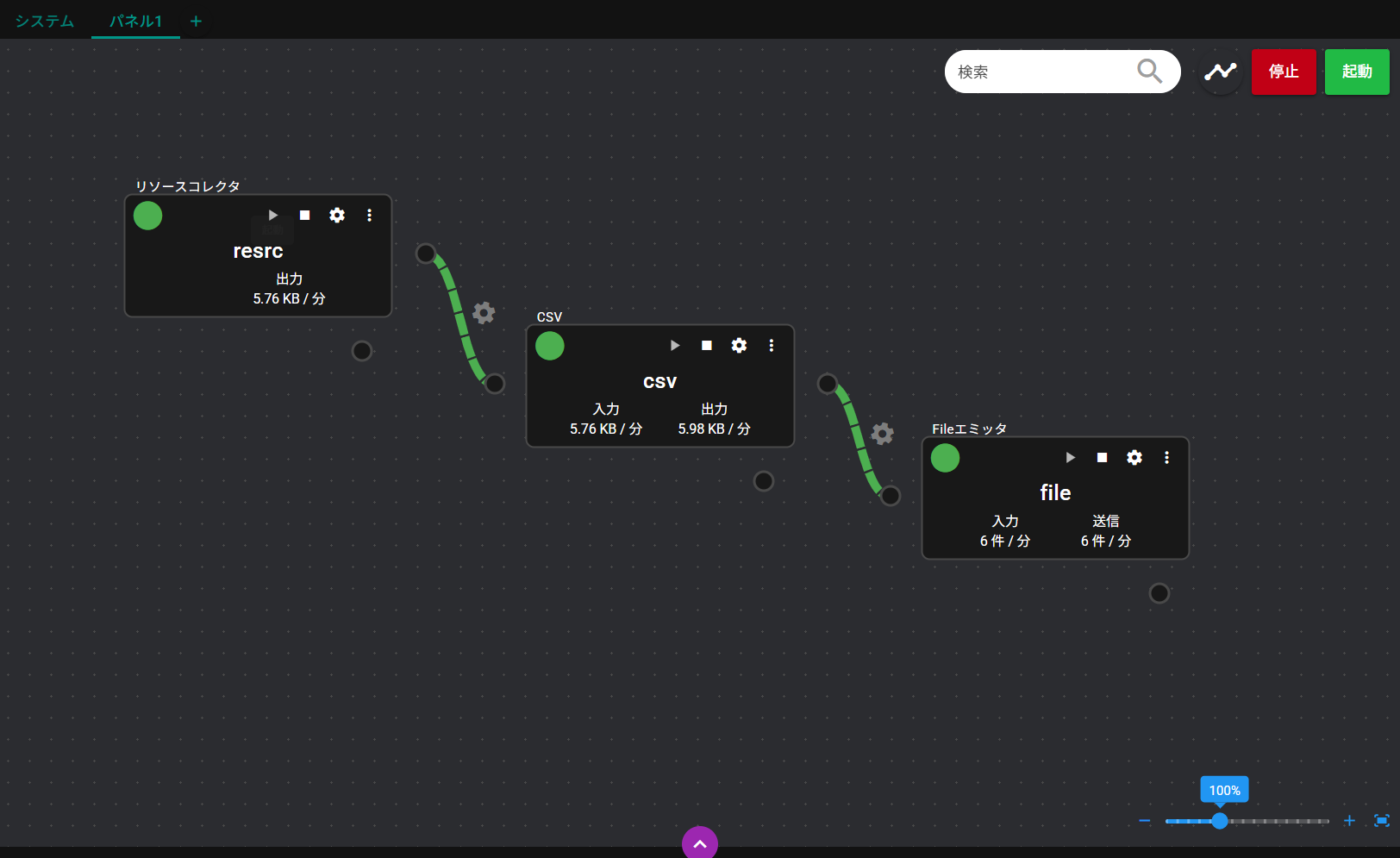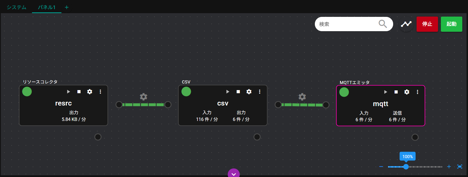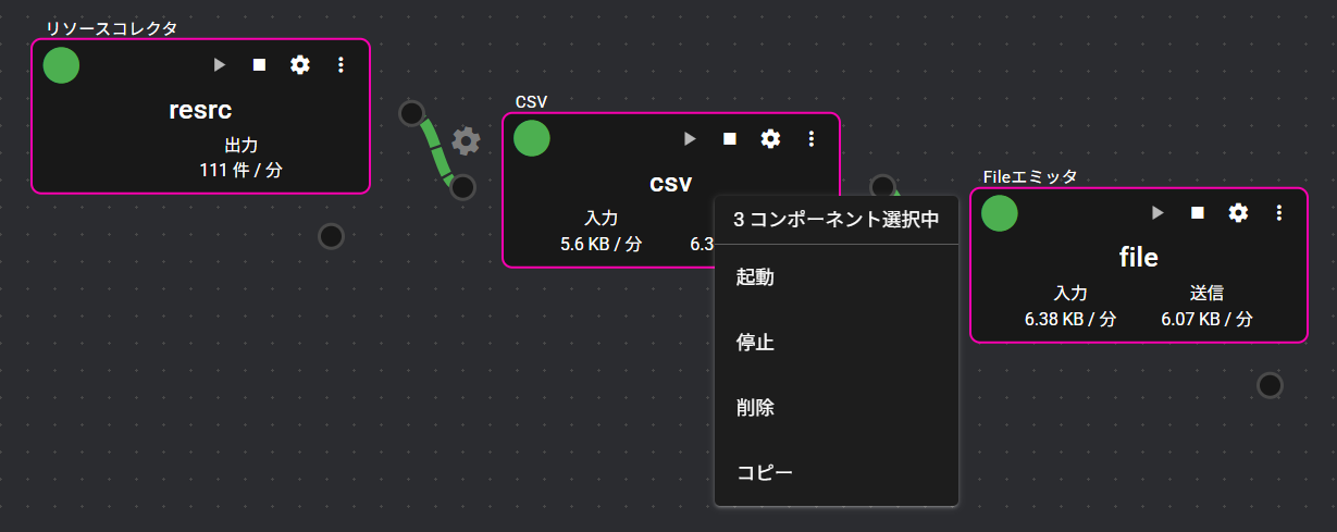 | ⑥ | コンポーネント | パネルに登録されているコンポーネントです。 ※コンポーネントは、データの収集、加工、分析、送信などを実現するモジュール群です。 |