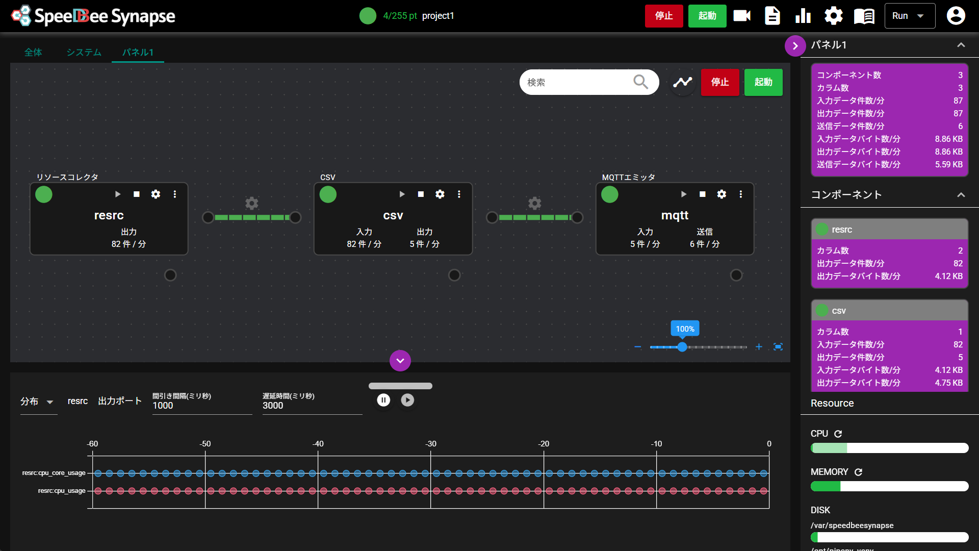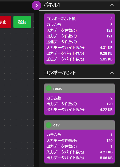 | ⑨ | データ量モニタ | コンポーネントが扱っているデータ量が表示されます。 |