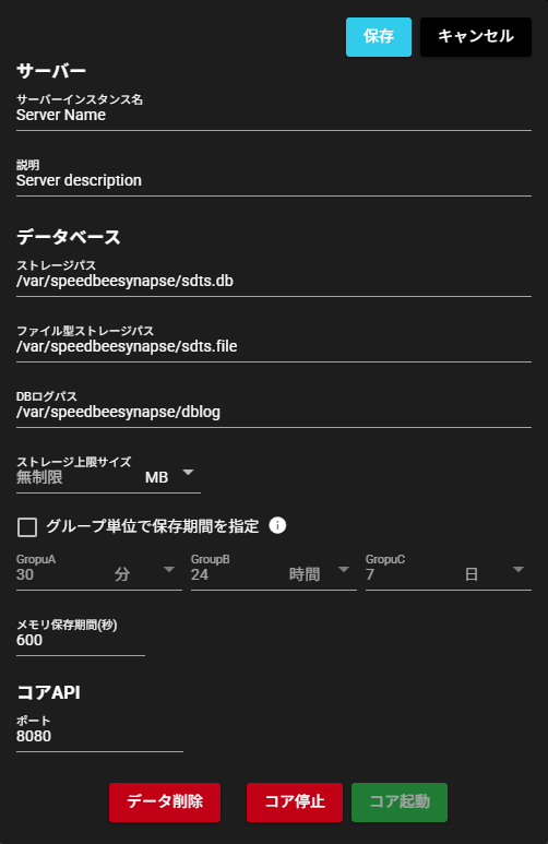 | ③ | 停止ボタン | クリックすると、SpeeDBee Synapseに登録されたすべてのコンポーネントが停止します。 |