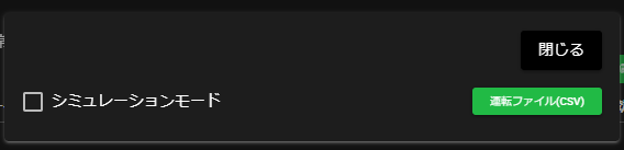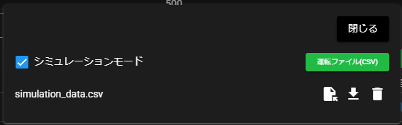 項目 説明 シミュレーションモード シミュレーションモードの有効・無効 運転ファイル(csv) シミュレーションモードで使用するカラムやデータを定義したCSV形式のファイル。詳細は、運転ファイルのフォーマットを参照してください。 運転ファイルは、一度アップロードすると、削除するまではその設定が保持されます。
