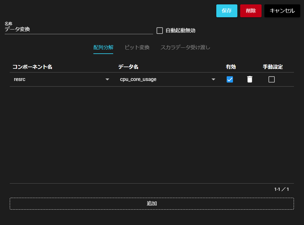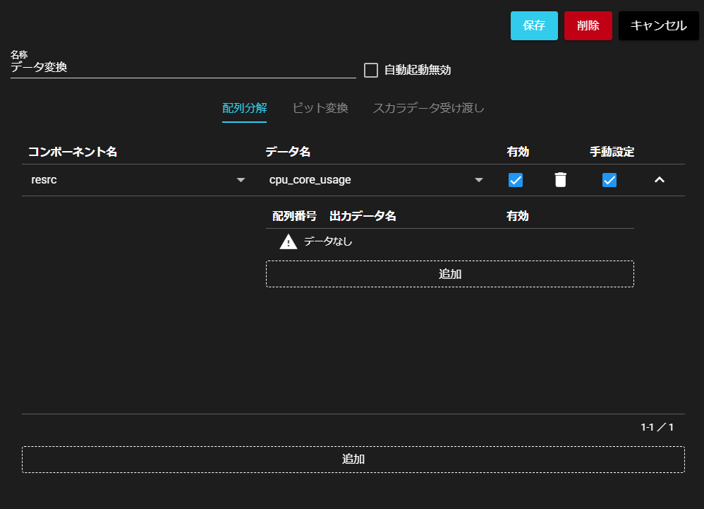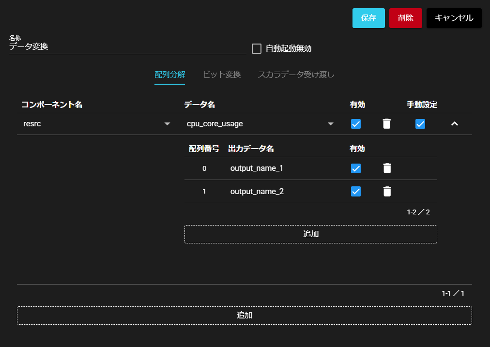 (配列カラムのみ設定可)有効 設定した入力データ設定を無効にする時はOFFにしてください 削除 設定した入力データ設定を削除する時に押下してください 手動設定 配列分解後の出力データ名を手動設定したい時はONにしてください