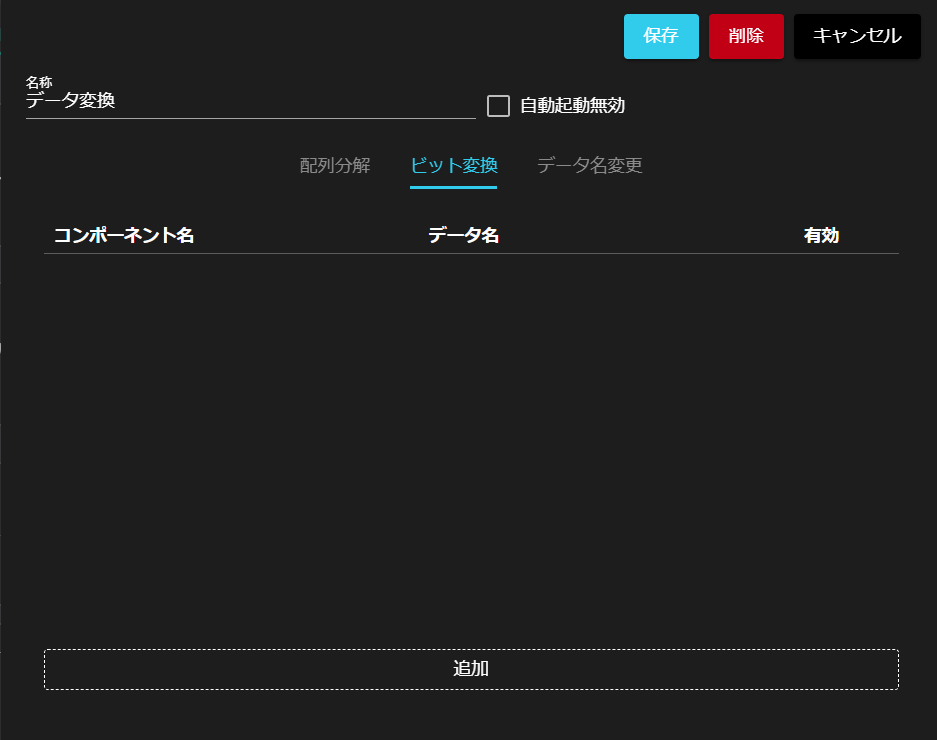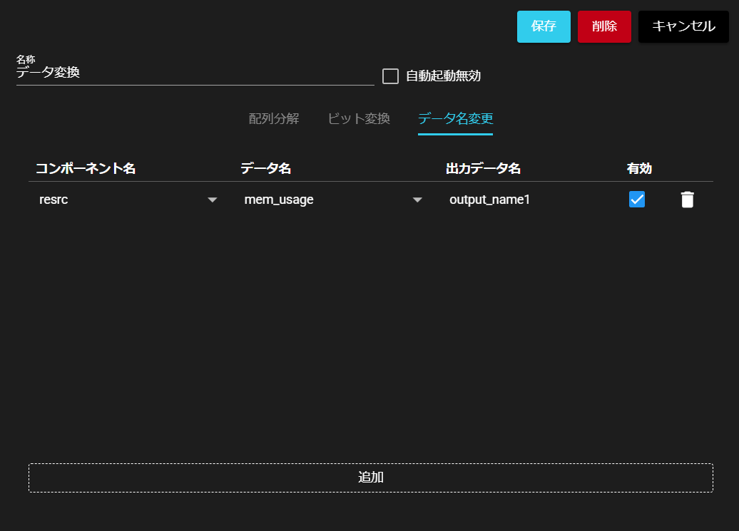 項目 説明 コンポーネント名 入力ポートに接続したコンポーネント名を設定 データ名 入力ポートに接続したコンポーネント名のデータ名を設定 出力データ名 出力データ名を設定 有効 設定した入力データ設定を無効にする時はOFFにしてください 削除 設定した入力データ設定を削除する時に押下してください -