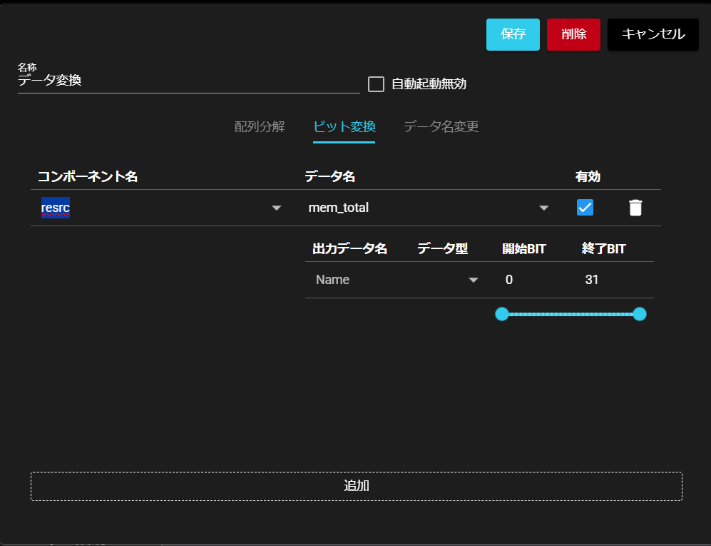 項目 説明 出力データ名 出力データ名を設定 データ型 出力するデータ型を設定 開始BIT 入力するデータから取得するデータの開始BITを設定。