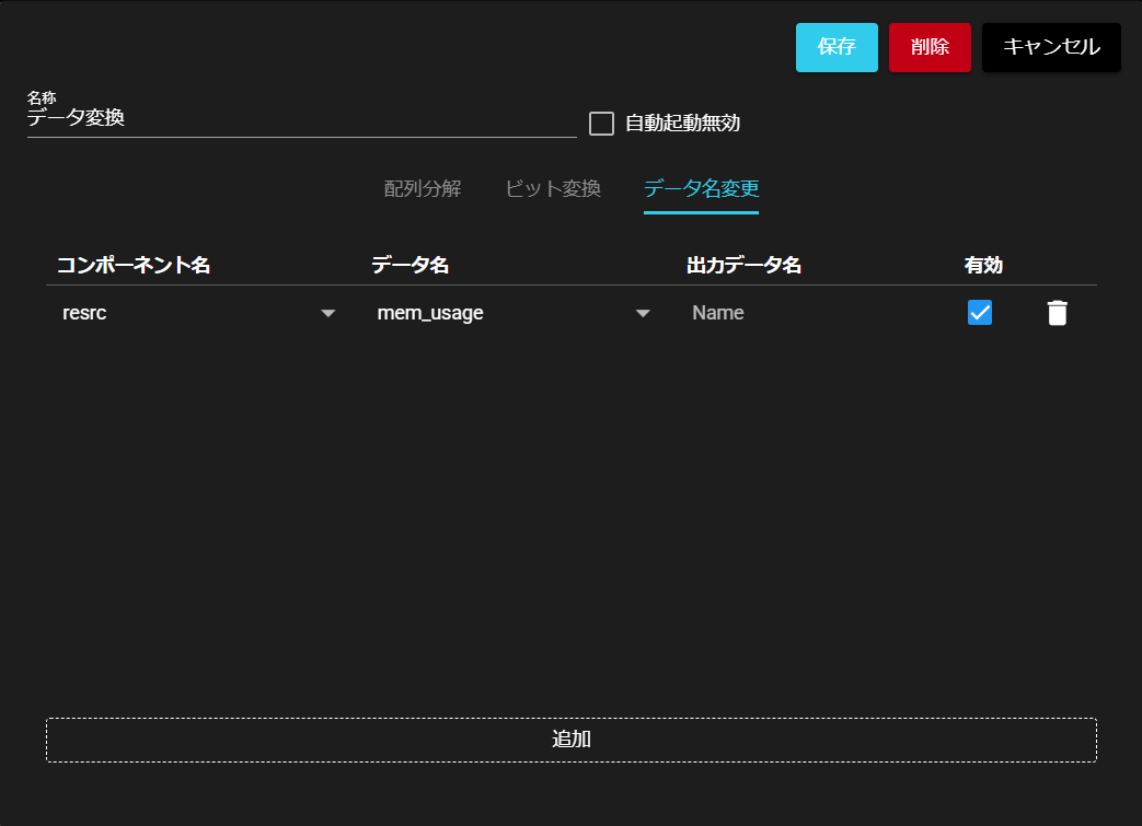 | データ名変更 | 入力データをそのまま別データとして名称を設定しカラムに登録します。 [対象カラム] 入力データの制限なし |