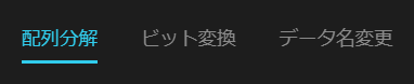 | ビット変換 | カラムのデータのbitN~bitMまでを整数化してカラムに登録します。 整数型スカラの場合、その整数のbitN~bitMをそのまま扱います。 bool型配列の場合、配列の各要素[N]~[M]をbitN~bitMとして扱います INT8/UINT8型配列の場合、各要素は8bitあるが 0 or !0でbit化し、 各要素[N]~[M]をbitN~bitMとして扱います [対象カラム] 整数型スカラ BOOLEAN型配列 INT8/UINT8型配列 (ただし各要素は0 or 1として扱う) |