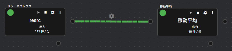 | ポート | 入力:1 他のコンポーネントからデータを受け取ります。 出力:1 「設定方法」によって設定された内容をもとに、入力データの移動平均値を出力します。 システム:1 コンポーネントの稼働状況やエラー情報を出力します。出力するエラー情報の詳細は、「エラーコード一覧」をご覧ください。 |